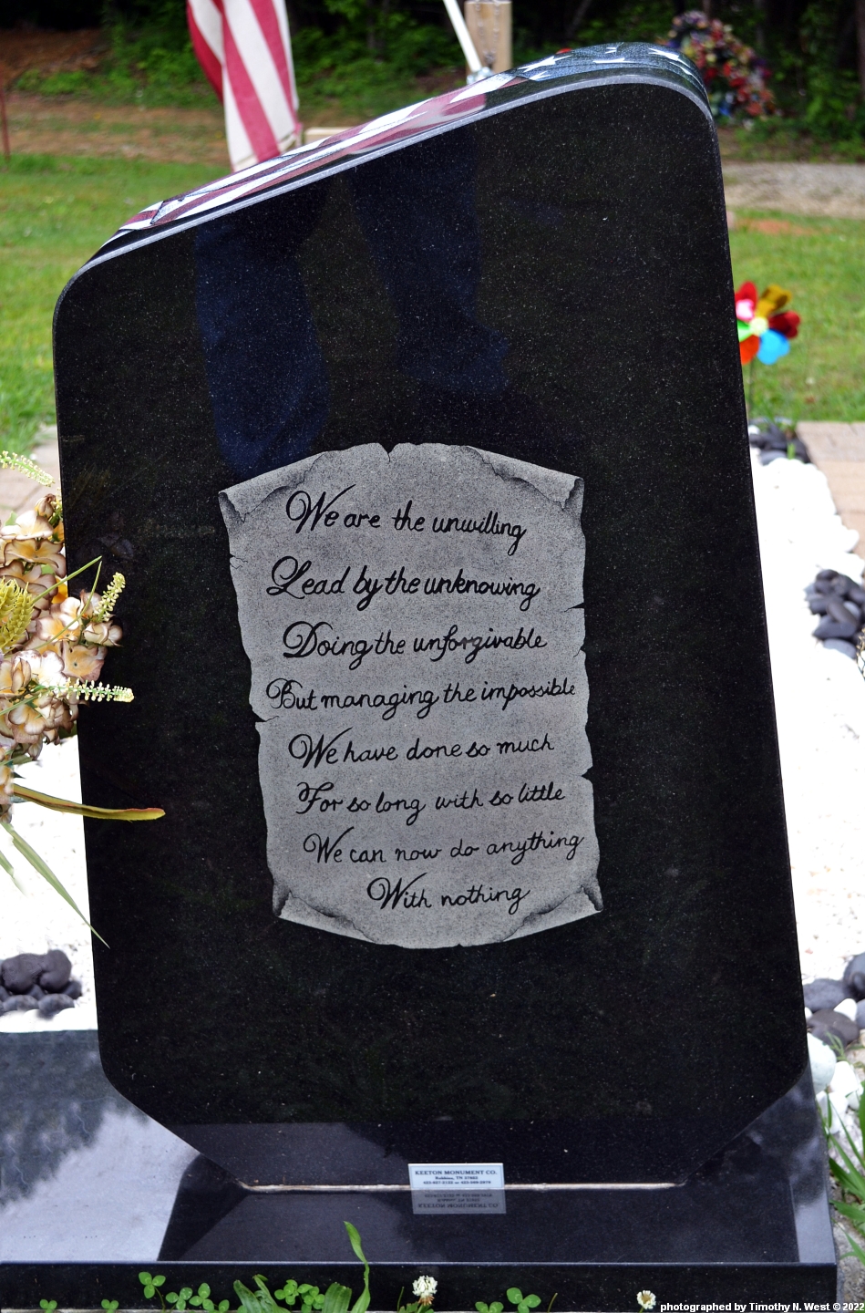 Inscription: SPC.; (Joey); As long as we live,/you live; We ar e the unwilling/Lead by the unknowing/Doing the unforgivable/But managing the impossible/We have done so much/For so long with so little/We can now do anything/with nothing; Alley/Zoey/Journey/Joeie