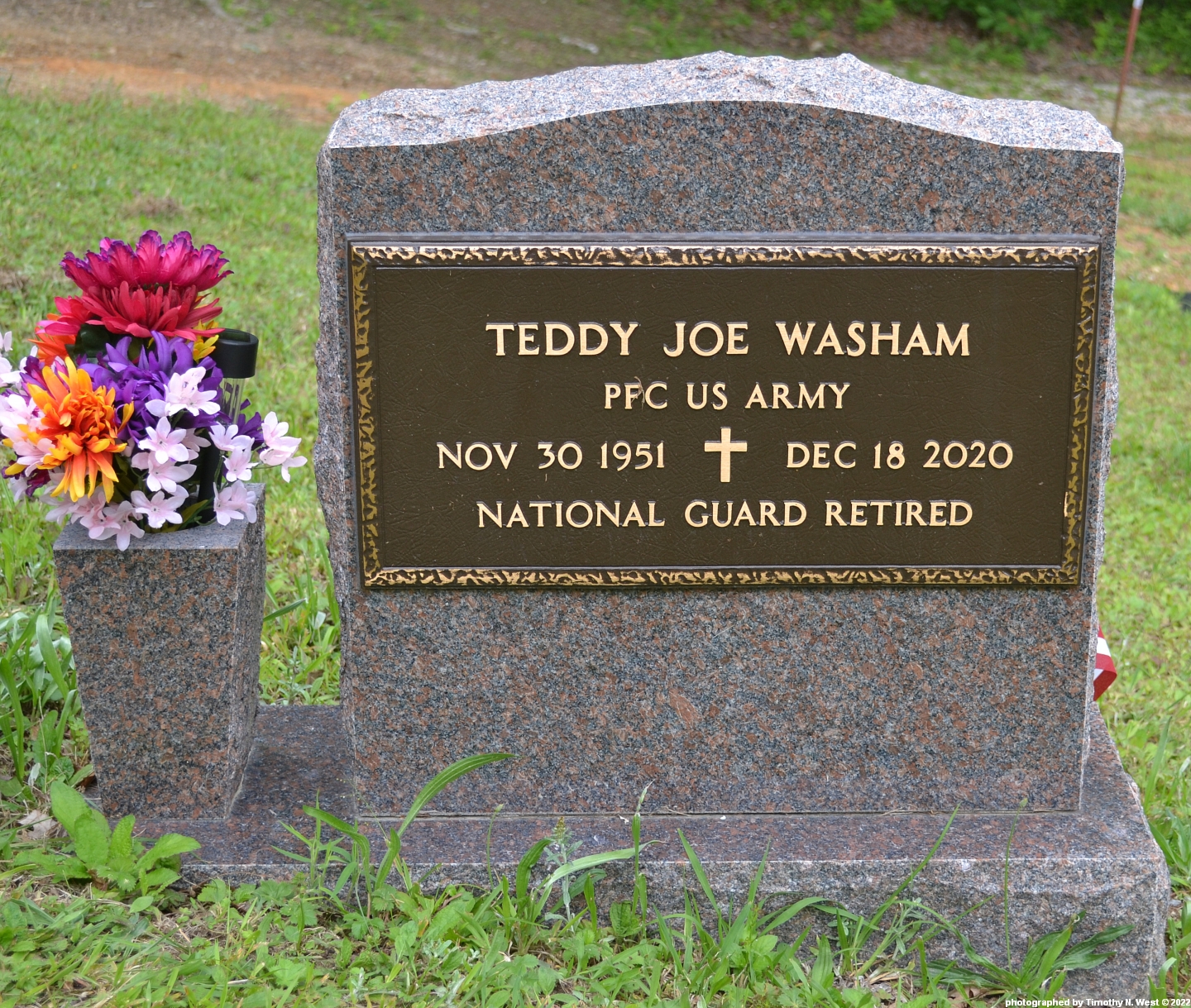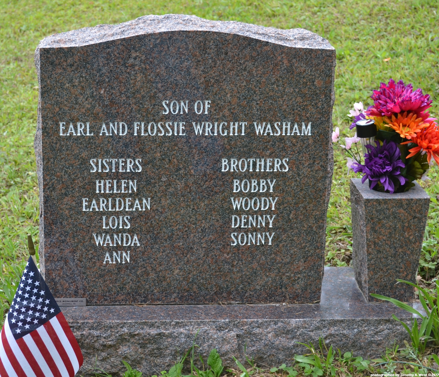 Inscription: PFC US Army; National Guard retired; s/o Earl and Flossie Wright Washam; Sisters/Helen/Earldean/Lois/Wanda/Ann; Brothers/Bobby/Woody/Denny/Sonny