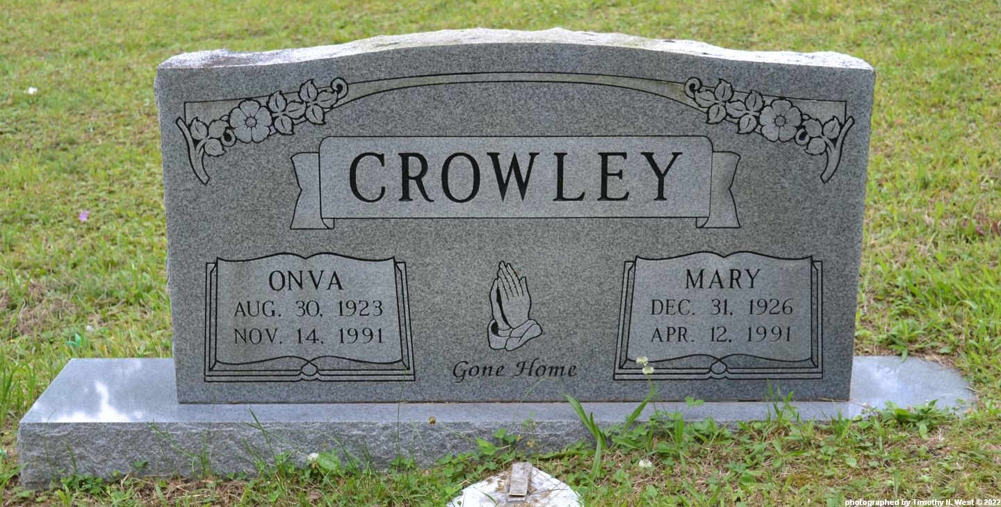 Transcriber Comments: SS: Onva Crowley; Robert Bailey's 1994 "Cemeteries of Scott County, Tennessee" book lists her name as "Mary E. Crowley"