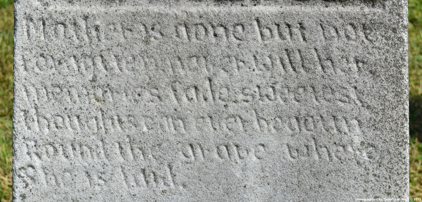 Inscription: Mother; Mother is gone but not/forever. Never will her/memories fade. Sweetest/thoughts can ever be going[?]/round the grave where/she is liked