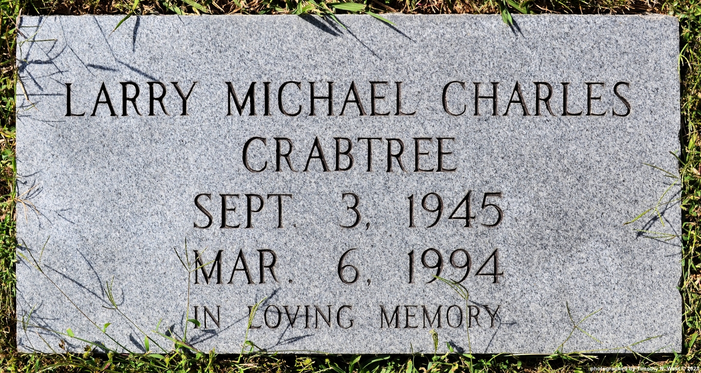 Transcriber Comments: flat stone; Robert Bailey's 1994 "Cemeteries of Scott County, Tennessee" book lists his name as "Larry Michael Crabtree Charles"