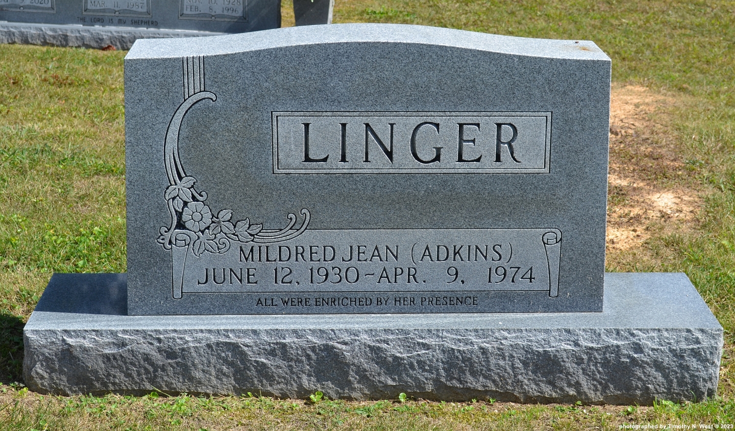 Transcriber Comments: Robert Bailey's 1994 "Cemeteries of Scott County, Tennessee" book lists her twice once as "Mildred Jean Adkins" and again as "Mildred Jean Linger"