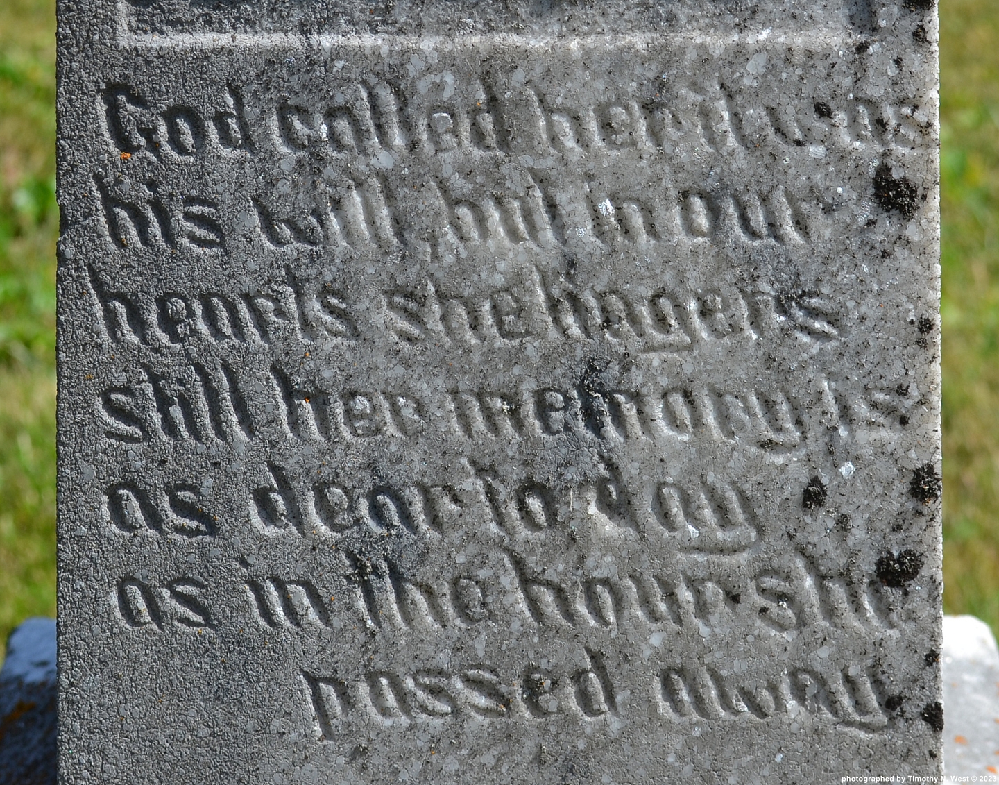 Inscription: God called her it was/his will, but in our/hearts she lingers/still her memory is/as dear today/as in the hour she passed away