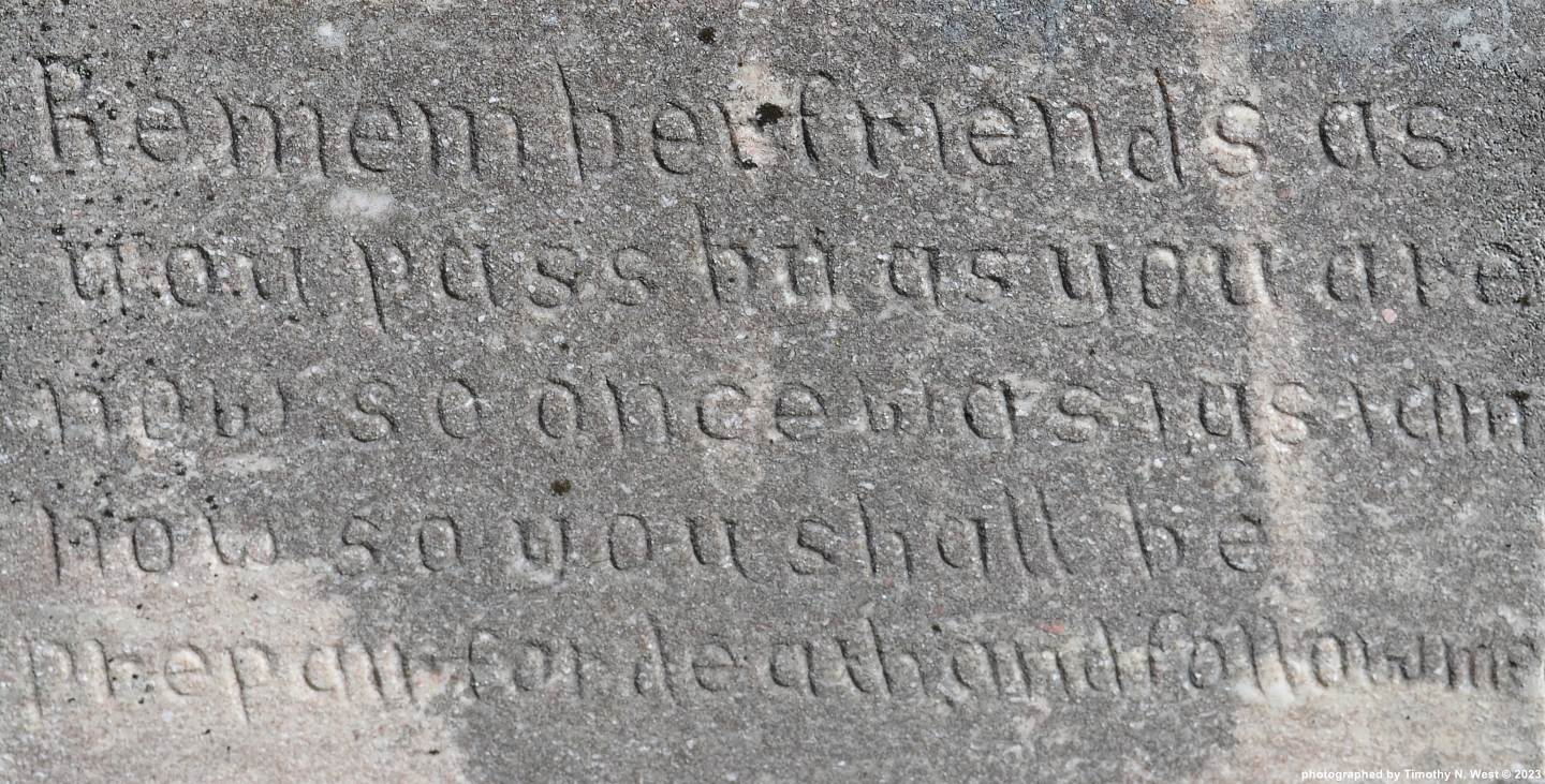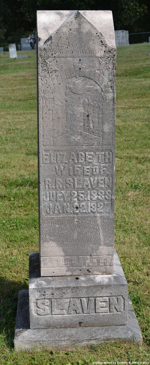 Inscription: w/o R. R. Slaven; In my fathers house/are many mansions; Remember friends as/you pass by as you are/now so once was I as am/now so you shall be/prepare for death and follow me