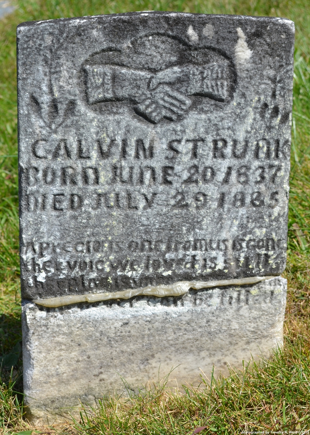 Transcriber Comments: the rest of the epitaph is obscured by the repair work to this broken stone; notice the misspellings in the epitaph