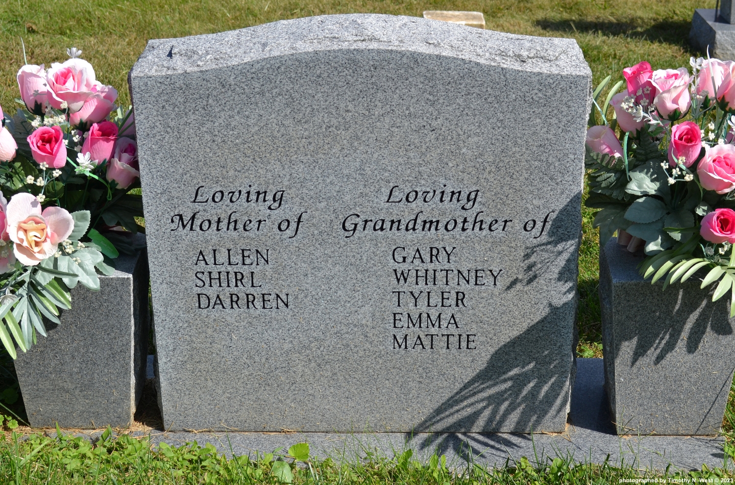 Inscription: Loving mother; Loving mother of/Allen/Shirl/Darren; Loving grandmother of/Gary/Whitney/Tyler/Emma/Mattie