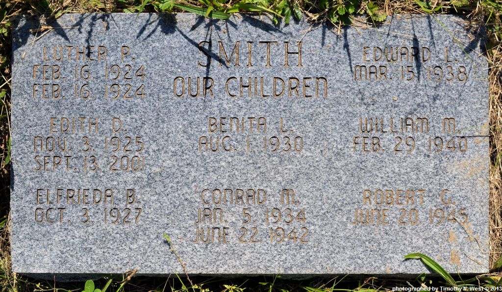 Transcriber Comments: flat stone; name and dates appear on flat stone listing the Smith children: Luther P., Edith D., Elfrieda B., Benita L., Conrad M., Edward L., William M., and Robert G.